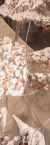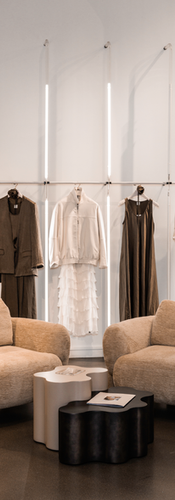Attorno a questa scultura si sviluppa un sistema di pannelli e superfici tessili sovrapposte. Il layering non è solo visivo, è concettuale, richiama il modo in cui una collezione prende forma, passando da idea a prodotto.